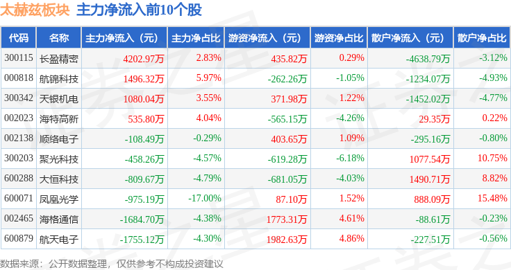 从资金流向上来看,当日太赫兹板块主力资金净流出10.22亿元,游资资金净流入2.96亿元,散户资金净流入7.26亿元。太赫兹板块个股资金流向见下表: