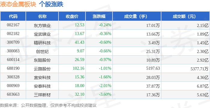 证券之星消息,11月20日液态金属板块较上一交易日下跌1.36%,三祥新材领跌。当日上证指数报收于3931.05,下跌0.4%。深证成指报收于12980.82,下跌0.76%。液态金属板块个股涨跌见下表: