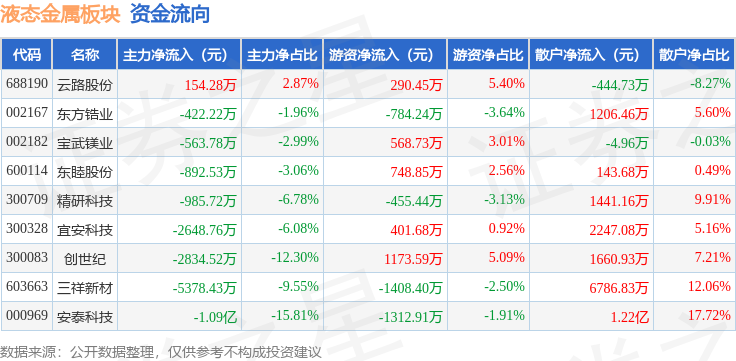 从资金流向上来看,当日液态金属板块主力资金净流出2.44亿元,游资资金净流出777.69万元,散户资金净流入2.52亿元。液态金属板块个股资金流向见下表: