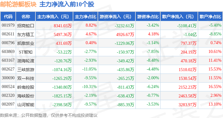 从资金流向上来看,当日邮轮游艇板块主力资金净流出9.35亿元,游资资金净流入1.4亿元,散户资金净流入7.95亿元。邮轮游艇板块个股资金流向见下表: