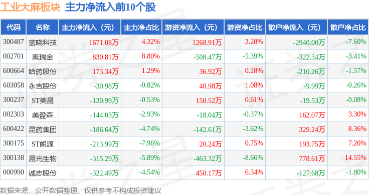 从资金流向上来看,当日工业大麻板块主力资金净流出2.83亿元,游资资金净流入4123.4万元,散户资金净流入2.42亿元。工业大麻板块个股资金流向见下表: