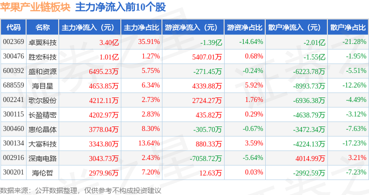 从资金流向上来看,当日苹果产业链板块主力资金净流出37.93亿元,游资资金净流入3.77亿元,散户资金净流入34.16亿元。苹果产业链板块个股资金流向见下表: