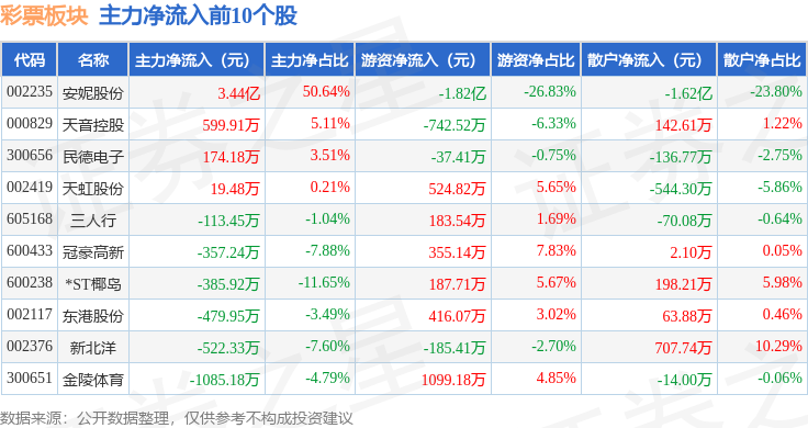 从资金流向上来看,当日彩票板块主力资金净流入1.26亿元,游资资金净流出1.67亿元,散户资金净流入4079.29万元。彩票板块个股资金流向见下表: