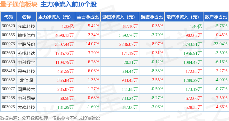 从资金流向上来看,当日量子通信板块主力资金净流出19.41亿元,游资资金净流入7.29亿元,散户资金净流入12.12亿元。量子通信板块个股资金流向见下表: