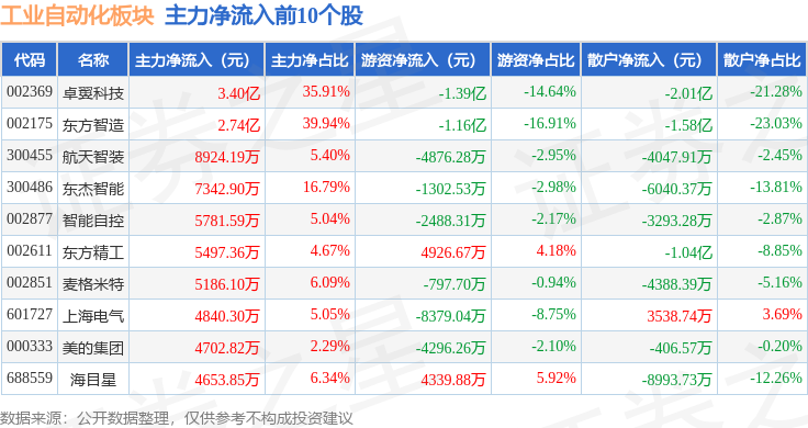 从资金流向上来看,当日工业自动化板块主力资金净流出16.07亿元,游资资金净流入1407.31万元,散户资金净流入15.93亿元。工业自动化板块个股资金流向见下表: