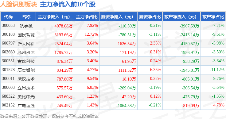 从资金流向上来看,当日人脸识别板块主力资金净流出6.99亿元,游资资金净流入1.01亿元,散户资金净流入5.98亿元。人脸识别板块个股资金流向见下表: