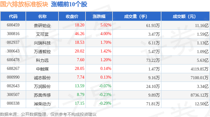 证券之星消息,11月20日国六排放标准板块较上一交易日下跌1.22%,华丰股份领跌。当日上证指数报收于3931.05,下跌0.4%。深证成指报收于12980.82,下跌0.76%。国六排放标准板块个股涨跌见下表: