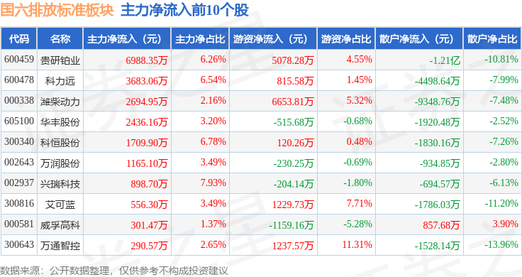 从资金流向上来看,当日国六排放标准板块主力资金净流出5.48亿元,游资资金净流出3139.17万元,散户资金净流入5.8亿元。国六排放标准板块个股资金流向见下表: