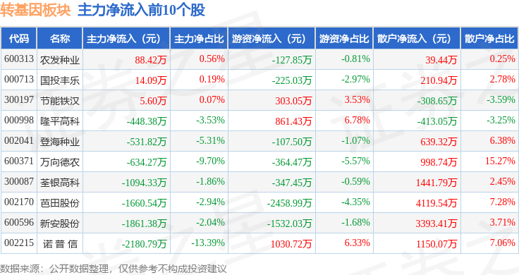 从资金流向上来看,当日转基因板块主力资金净流出1.27亿元,游资资金净流出84.4万元,散户资金净流入1.27亿元。转基因板块个股资金流向见下表: