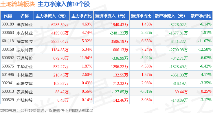 从资金流向上来看,当日土地流转板块主力资金净流出2.58亿元,游资资金净流入1.52亿元,散户资金净流入1.06亿元。土地流转板块个股资金流向见下表: