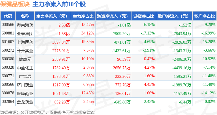 从资金流向上来看,当日保健品板块主力资金净流出3.72亿元,游资资金净流入1.61亿元,散户资金净流入2.11亿元。保健品板块个股资金流向见下表: