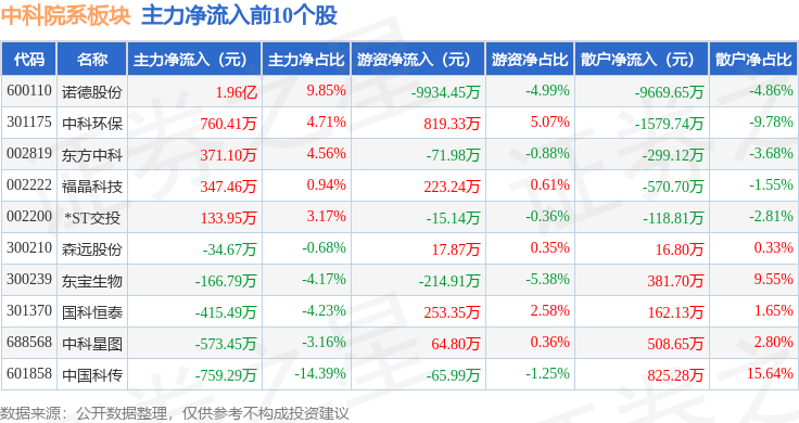 从资金流向上来看,当日中科院系板块主力资金净流出1.25亿元,游资资金净流入1378.18万元,散户资金净流入1.11亿元。中科院系板块个股资金流向见下表: