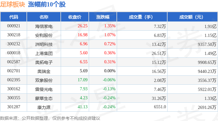 证券之星消息,11月20日足球板块较上一交易日下跌1.12%,华夏幸福领跌。当日上证指数报收于3931.05,下跌0.4%。深证成指报收于12980.82,下跌0.76%。足球板块个股涨跌见下表: