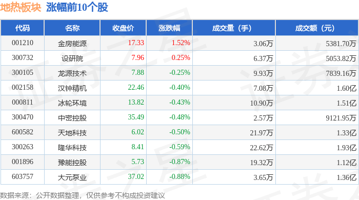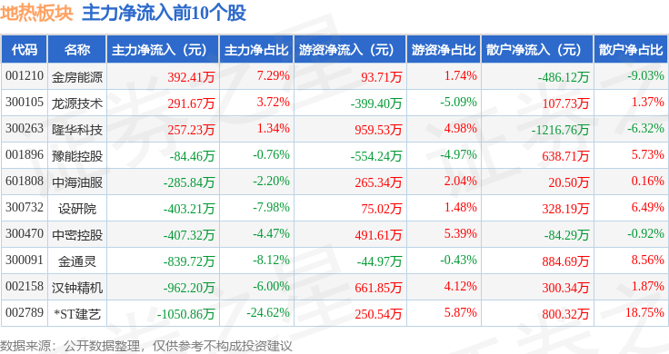 从资金流向上来看,当日地热板块主力资金净流出5.05亿元,游资资金净流出8708.15万元,散户资金净流入5.92亿元。地热板块个股资金流向见下表:
