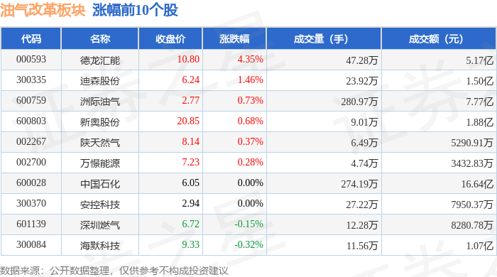 从资金流向上来看,当日油气改革板块主力资金净流出11.97亿元,游资资金净流入1.21亿元,散户资金净流入10.77亿元。油气改革板块个股资金流向见下表: