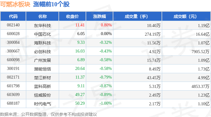 证券之星消息,11月20日可燃冰板块较上一交易日下跌1.18%,仁智股份领跌。当日上证指数报收于3931.05,下跌0.4%。深证成指报收于12980.82,下跌0.76%。可燃冰板块个股涨跌见下表: