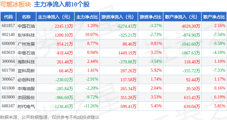 从资金流向上来看,当日可燃冰板块主力资金净流出7.08亿元,游资资金净流入2158.1万元,散户资金净流入6.87亿元。可燃冰板块个股资金流向见下表: