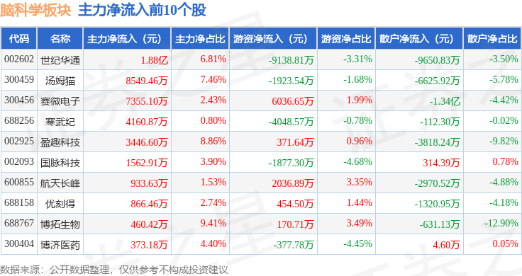 从资金流向上来看,当日脑科学板块主力资金净流出5.07亿元,游资资金净流出1503.09万元,散户资金净流入5.22亿元。脑科学板块个股资金流向见下表: