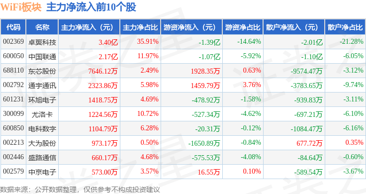 从资金流向上来看,当日WiFi板块主力资金净流出8.47亿元,游资资金净流入9812.01万元,散户资金净流入7.48亿元。WiFi板块个股资金流向见下表: