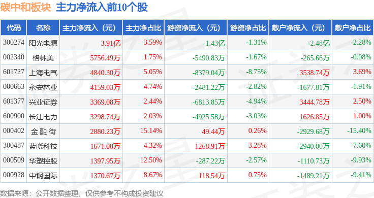 从资金流向上来看,当日碳中和板块主力资金净流出9.82亿元,游资资金净流出4.49亿元,散户资金净流入14.32亿元。碳中和板块个股资金流向见下表:
