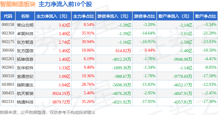 从资金流向上来看,当日智能制造板块主力资金净流出48.2亿元,游资资金净流入2.34亿元,散户资金净流入45.86亿元。智能制造板块个股资金流向见下表: