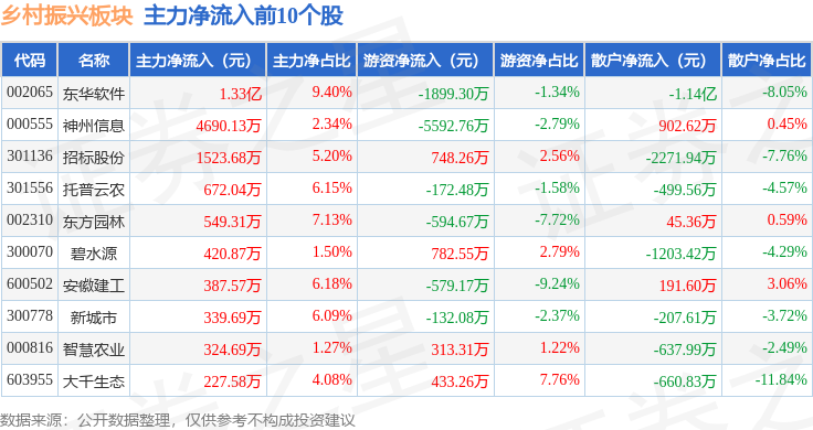 从资金流向上来看,当日乡村振兴板块主力资金净流出4.5亿元,游资资金净流出4875.44万元,散户资金净流入4.99亿元。乡村振兴板块个股资金流向见下表: