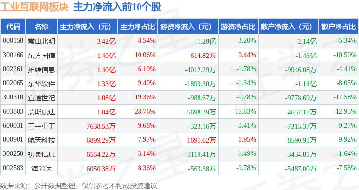 从资金流向上来看,当日工业互联网板块主力资金净流出18.47亿元,游资资金净流出8622.69万元,散户资金净流入19.33亿元。工业互联网板块个股资金流向见下表: