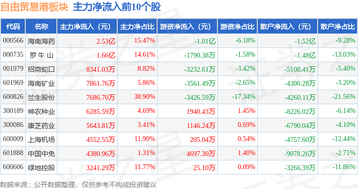 从资金流向上来看,当日自由贸易港板块主力资金净流入2.75亿元,游资资金净流出892.45万元,散户资金净流出2.66亿元。自由贸易港板块个股资金流向见下表: