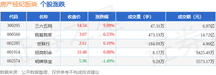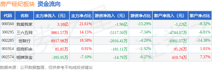 从资金流向上来看,当日房产经纪板块主力资金净流入5.03亿元,游资资金净流出2.69亿元,散户资金净流出2.34亿元。房产经纪板块个股资金流向见下表: