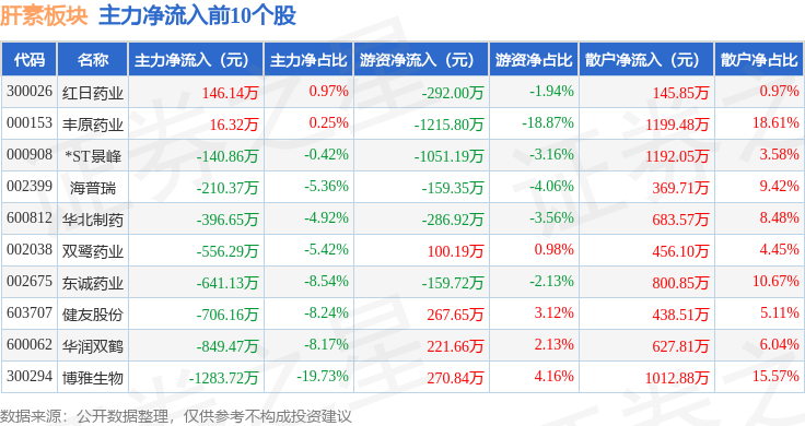 从资金流向上来看,当日肝素板块主力资金净流出2.7亿元,游资资金净流入2731.57万元,散户资金净流入2.43亿元。肝素板块个股资金流向见下表: