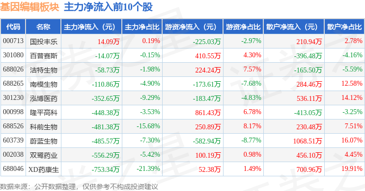 从资金流向上来看,当日基因编辑板块主力资金净流出4.57亿元,游资资金净流入8156.28万元,散户资金净流入3.75亿元。基因编辑板块个股资金流向见下表: