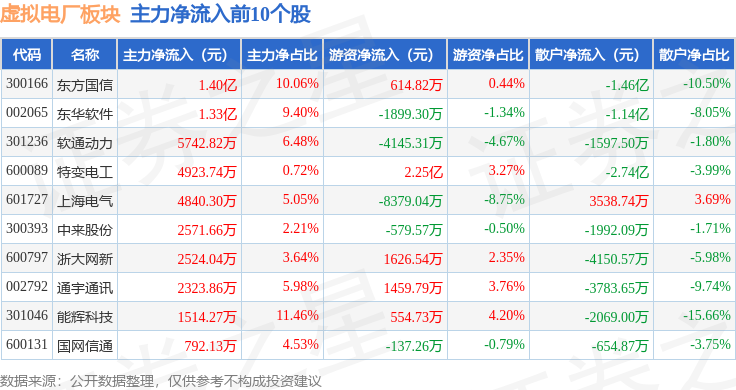 从资金流向上来看,当日虚拟电厂板块主力资金净流出10.06亿元,游资资金净流入3.57亿元,散户资金净流入6.49亿元。虚拟电厂板块个股资金流向见下表: