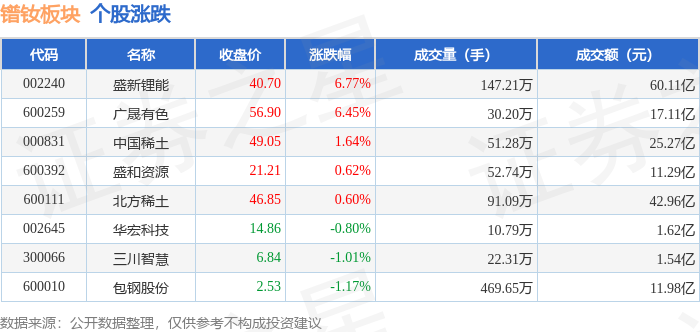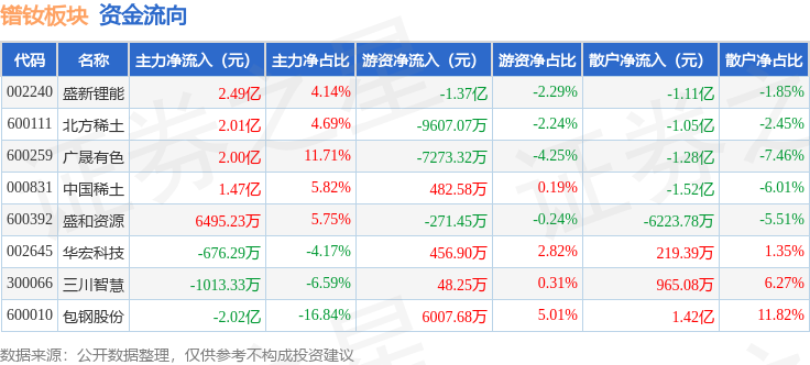 从资金流向上来看,当日镨钕板块主力资金净流入6.44亿元,游资资金净流出2.39亿元,散户资金净流出4.05亿元。镨钕板块个股资金流向见下表: