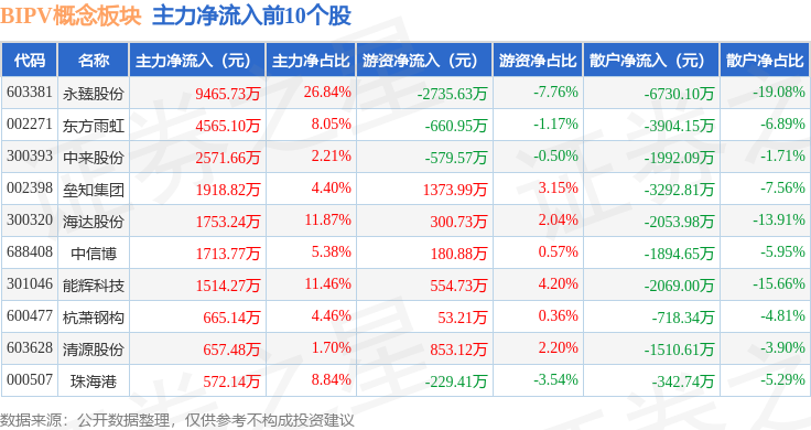 从资金流向上来看,当日BIPV概念板块主力资金净流出16.7亿元,游资资金净流入1.57亿元,散户资金净流入15.13亿元。BIPV概念板块个股资金流向见下表: