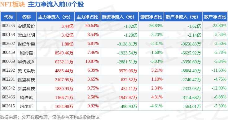 从资金流向上来看,当日NFT板块主力资金净流出8.98亿元,游资资金净流出2.88亿元,散户资金净流入11.87亿元。NFT板块个股资金流向见下表: