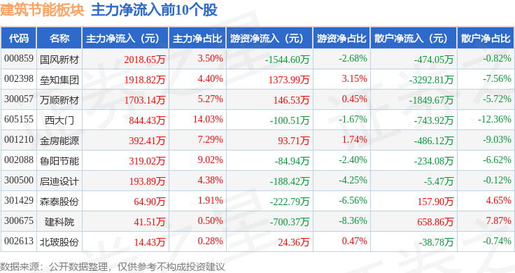 从资金流向上来看,当日建筑节能板块主力资金净流出1.06亿元,游资资金净流出2067.54万元,散户资金净流入1.26亿元。建筑节能板块个股资金流向见下表: