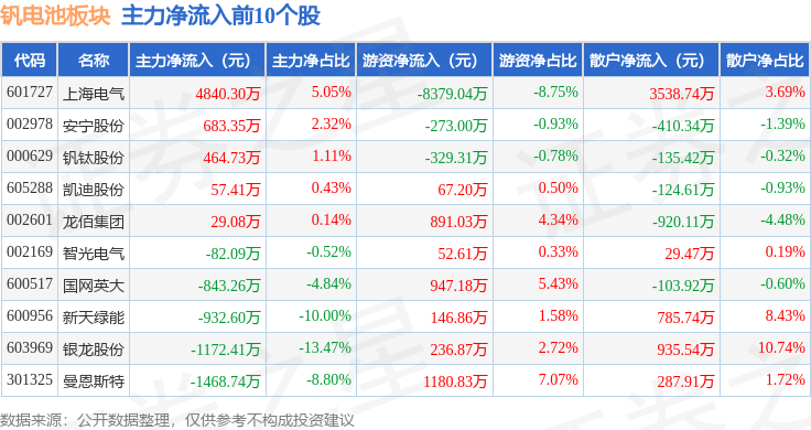 从资金流向上来看,当日钒电池板块主力资金净流出9.48亿元,游资资金净流出2072.79万元,散户资金净流入9.69亿元。钒电池板块个股资金流向见下表: