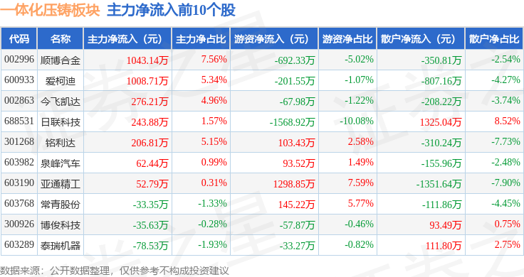 从资金流向上来看,当日一体化压铸板块主力资金净流出8.2亿元,游资资金净流出3544.84万元,散户资金净流入8.56亿元。一体化压铸板块个股资金流向见下表: