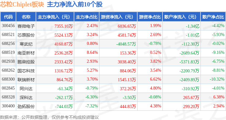 从资金流向上来看,当日芯粒Chiplet板块主力资金净流出4.14亿元,游资资金净流入9595.1万元,散户资金净流入3.18亿元。芯粒Chiplet板块个股资金流向见下表: