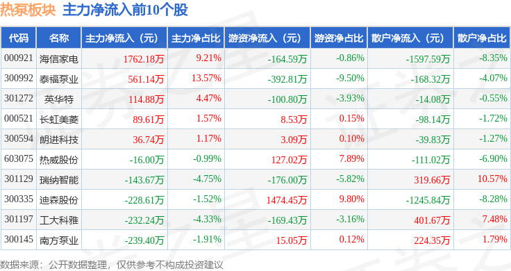 从资金流向上来看,当日热泵板块主力资金净流出6.77亿元,游资资金净流出164.45万元,散户资金净流入6.79亿元。热泵板块个股资金流向见下表: