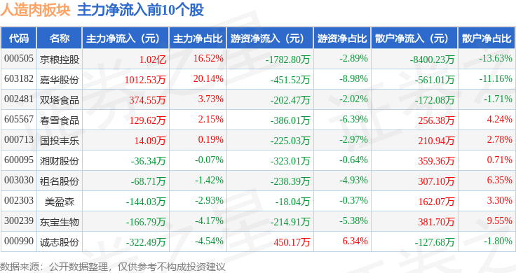 从资金流向上来看,当日人造肉板块主力资金净流出2.47亿元,游资资金净流出382.8万元,散户资金净流入2.51亿元。人造肉板块个股资金流向见下表:
