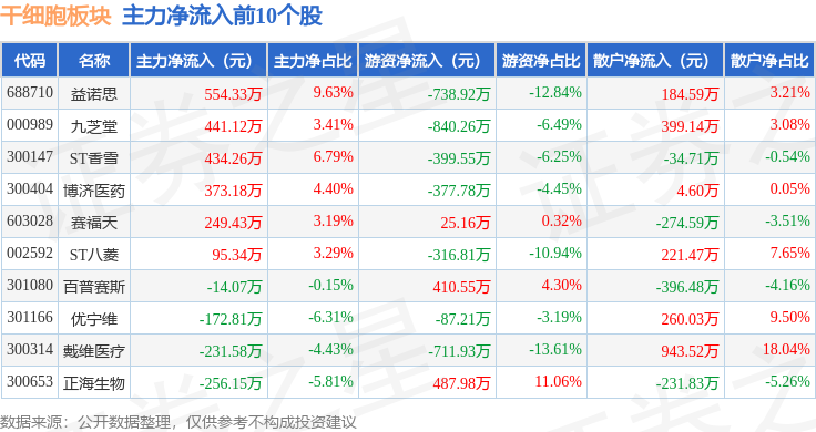 从资金流向上来看,当日干细胞板块主力资金净流出7.38亿元,游资资金净流入9226.52万元,散户资金净流入6.46亿元。干细胞板块个股资金流向见下表: