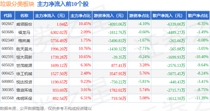 从资金流向上来看,当日垃圾分类板块主力资金净流出2.97亿元,游资资金净流入1.07亿元,散户资金净流入1.9亿元。垃圾分类板块个股资金流向见下表: