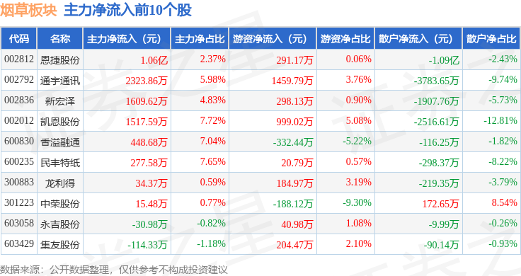 从资金流向上来看,当日烟草板块主力资金净流出1325.96万元,游资资金净流入5823.01万元,散户资金净流出4497.05万元。烟草板块个股资金流向见下表: