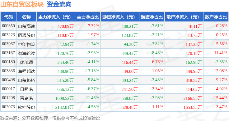 从资金流向上来看,当日山东自贸区板块主力资金净流出5287.87万元,游资资金净流出691.59万元,散户资金净流入5979.46万元。山东自贸区板块个股资金流向见下表: