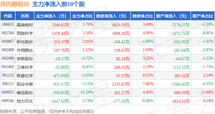 从资金流向上来看,当日异丙醇板块主力资金净流出2.45亿元,游资资金净流入1.49亿元,散户资金净流入9630.94万元。异丙醇板块个股资金流向见下表: