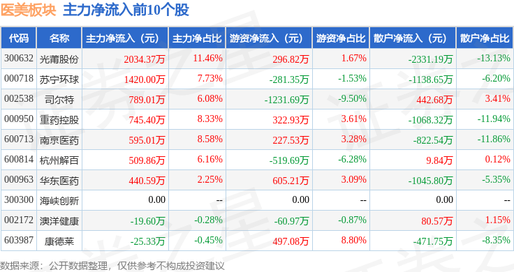 从资金流向上来看,当日医美板块主力资金净流出9.14亿元,游资资金净流入2.16亿元,散户资金净流入6.98亿元。医美板块个股资金流向见下表: