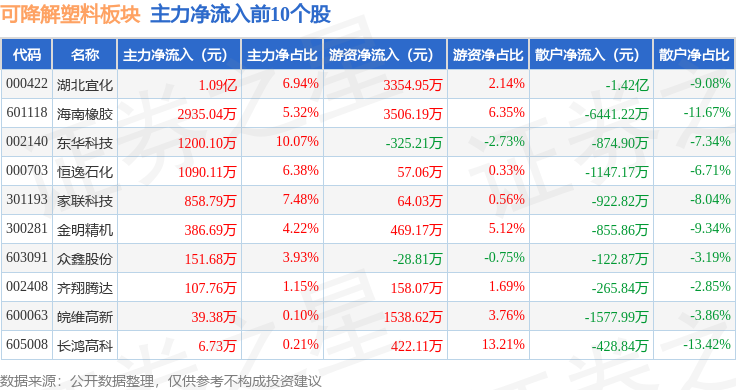 从资金流向上来看,当日可降解塑料板块主力资金净流出8.29亿元,游资资金净流入2.06亿元,散户资金净流入6.23亿元。可降解塑料板块个股资金流向见下表: