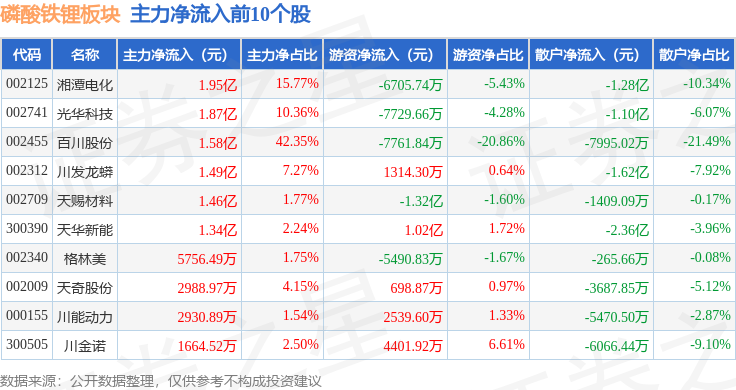 从资金流向上来看,当日磷酸铁锂板块主力资金净流出39.82亿元,游资资金净流出1.86亿元,散户资金净流入41.68亿元。磷酸铁锂板块个股资金流向见下表: