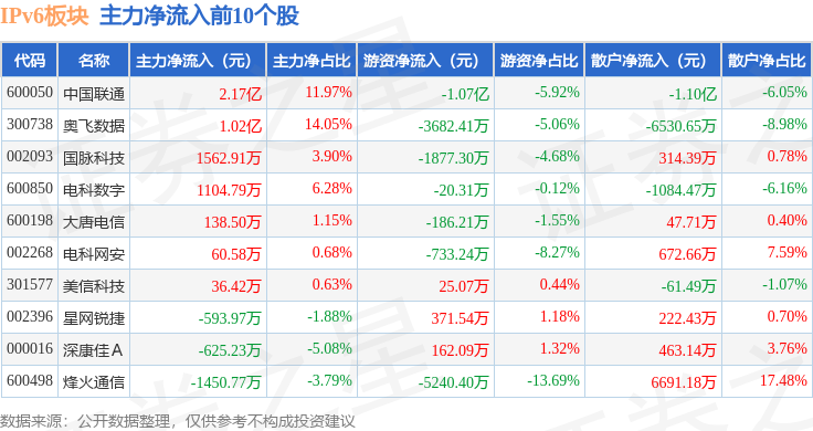 从资金流向上来看,当日IPv6板块主力资金净流出6.1亿元,游资资金净流出2995.74万元,散户资金净流入6.4亿元。IPv6板块个股资金流向见下表: